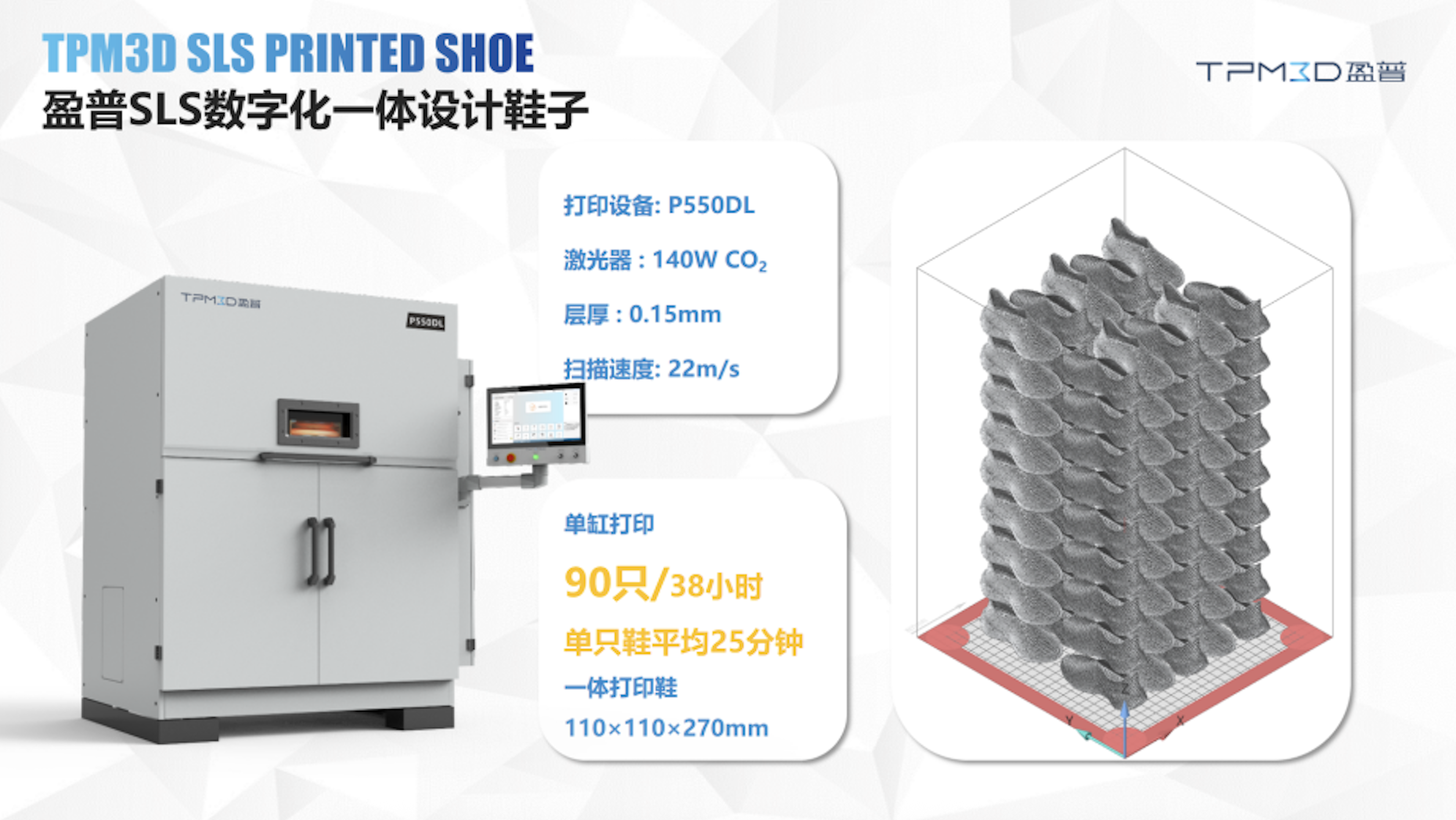 盈普大尺寸雙激光 SLS 增材制造設(shè)備 P550DL 以 0.15mm 層厚、最高 22m/s 掃描速度燒結(jié) Precimid 系列高分子粉末,單缸 38 小時(shí)可產(chǎn)出 90 只成品鞋,實(shí)現(xiàn)批量生產(chǎn)、從數(shù)據(jù)到成品無(wú)縫銜接。